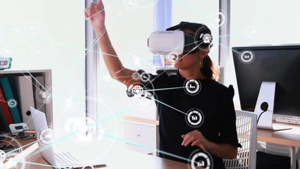 Businesswoman Using Headset With Data Analytics Overlay Videos