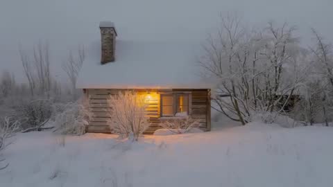 Camera Panning Across Snowy Log Cabin Porch At Dusk Lantern And String Lights Glowing Videos