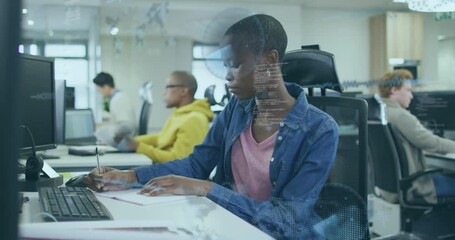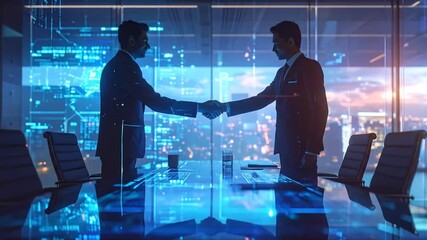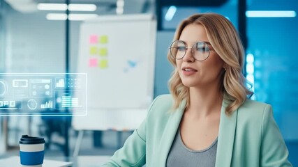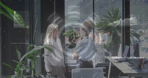 Collaboration In Futuristic Tech Office With Data Overlay Videos