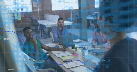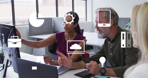 Colleagues Strategizing With Digital Icons Overlay In Modern Office Videos