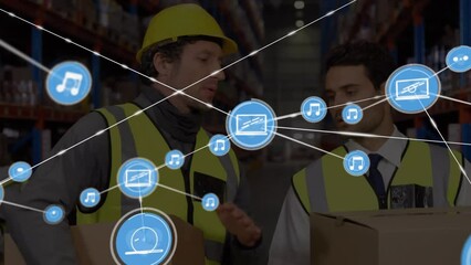 Connected Icons With Warehouse Workers Discussing Technology Videos