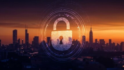 Cybersecurity Concept With Digital Lock Overlay On Cityscape Videos
