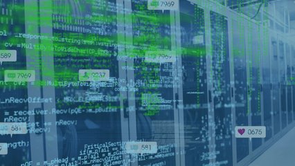 Data Processing Symbols Overlaying Modern Server Room Videos