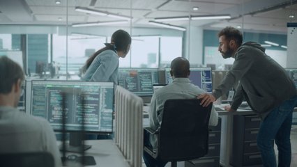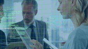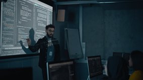Developers Collaborating At Shared Desk With Live Code Overlay Videos