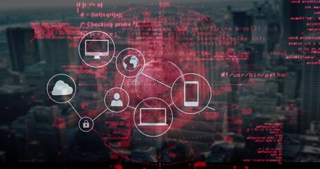 Digital Cloud Technology Icons Over Data Processing Cityscape Videos