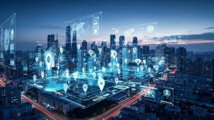 Digital Data Interface Overlaying Cityscape At Night Videos
