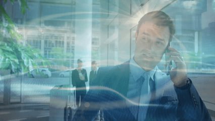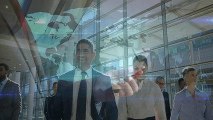 Digital Data Overlay On Business Professionals In Lobby Videos