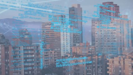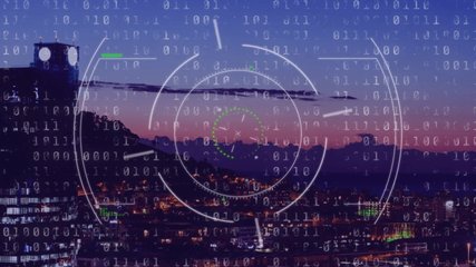 Digital Data Processing Over Urban Skyscrapers Overlay Videos
