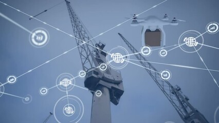Digital Drone And Network Graphics Over Construction Cranes Videos