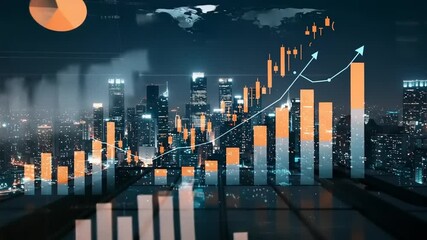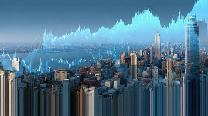 Digital Financial Data Overlaid On Urban Skyline Videos