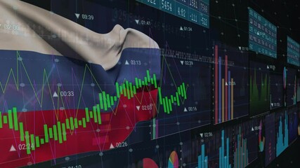 Digital Financial Data Overlay On Russian Flag Videos