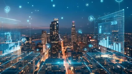 Digital Financial Data Overlays Cityscape Skyline Videos