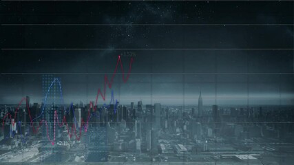 Digital Interface With Financial Graphs Over Cityscape Videos