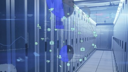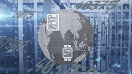 Digital Network Icons Over Server Room With Spinning Globe Videos