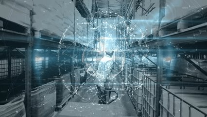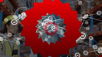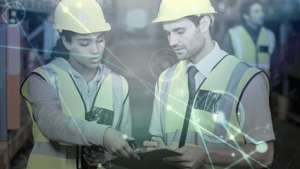 Digital Network Overlay On Warehouse Workers Discussing Operations Videos