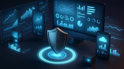 Digital Shield Surrounded By Cyber Security Statistics Animation Videos