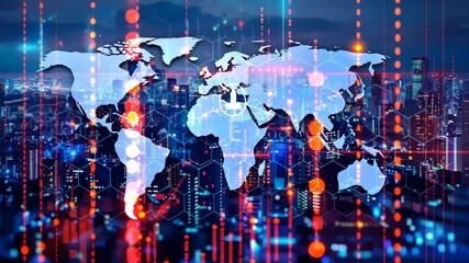 Digital World Map Overlay With Cityscape And Tech Elements Videos