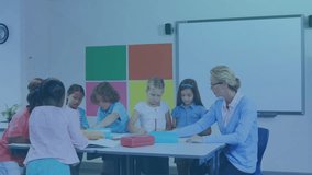 Diverse Children Learning With Digital Data Overlay In Modern Classroom Videos