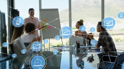 Diverse Professionals Collaborating In A Modern Office With Digital Icons Videos