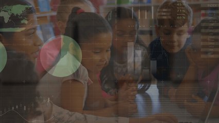 Diverse Schoolchildren Studying With Digital Network Interface Overlay Videos