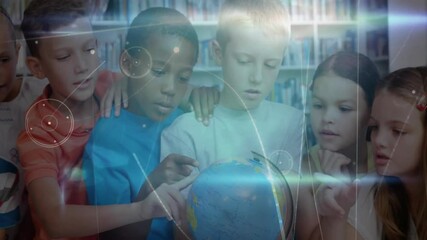 Diverse Students Collaborating In Library With Digital Connections Overlay Videos