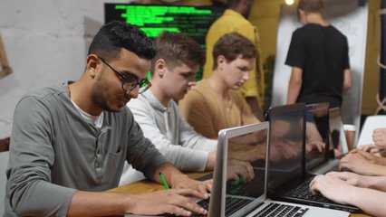 Diverse Students Collaborating On Coding Project With Animated Code Overlay Videos