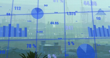 Dynamic Data Processing Animation Over Cityscape Background Videos
