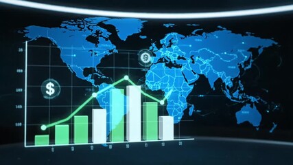 Dynamic Financial Data Display With World Map Overlay Videos
