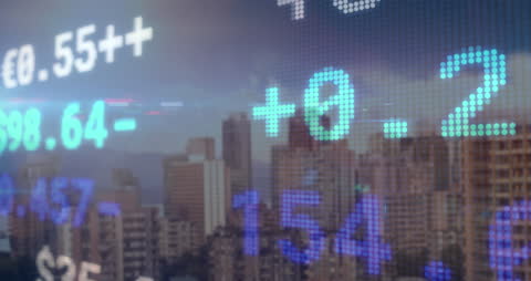 Dynamic Stock Market Data Overlaid On Skyscrapers Videos