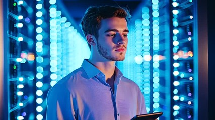 Engineer Analyzing Data On Tablet In Futuristic Server Room Videos