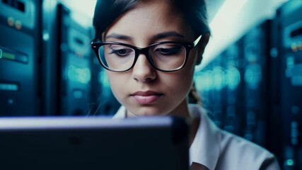 Engineer Analyzing Data On Tablet In Futuristic Server Room Videos
