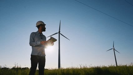 Engineer Observing Digital Globe And Wind Turbines Technology Concept Videos