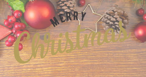 Festive Pine Cones And Gold Ribbon On Wood With Snowflake Overlay Videos