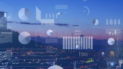 Financial Chart Data Over Urban Skyline At Sunset Videos