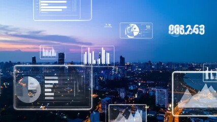 Financial Data Over Cityscape With Futuristic Overlay Videos