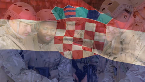 Flag Of Croatia Overlayed On Diverse Soldiers In Multicultural Military Display Videos
