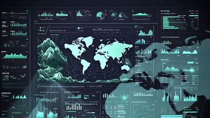 Futuristic Analytics Display With World Map And 3d Graphs Videos