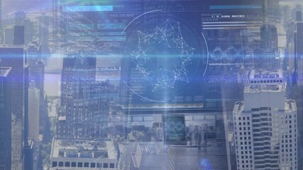 Futuristic Chemistry Data Interface Over Cityscape Videos