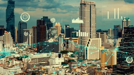 Futuristic Data Analytics Interface Over Urban Cityscape Videos