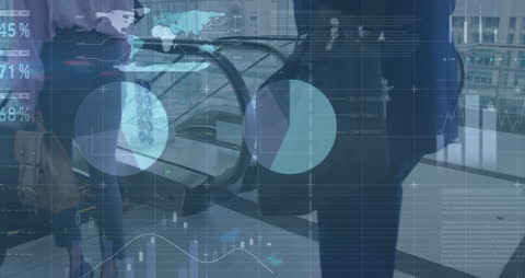 Futuristic Data Processing With Graphs Overlay And Walking People Videos