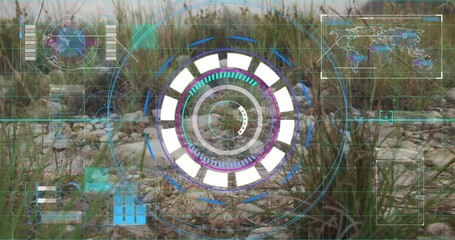Futuristic Digital World Map Overlaying Beach Scene Videos