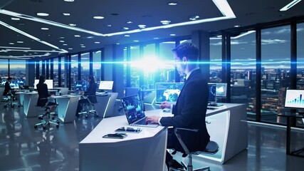 Futuristic Office Workspace With Data Interface Overlay Videos