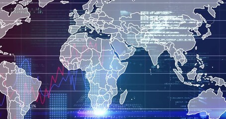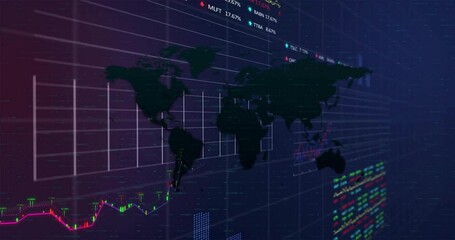 Global Financial Data Processing Over World Map On Dark Background Videos