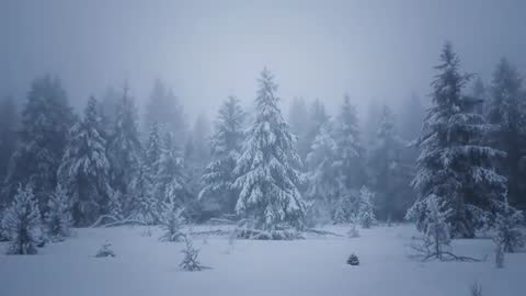 snow-covered evergreens