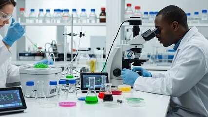 Lab Scientists Collaborating On Experiment With Green Chemical Solution Videos