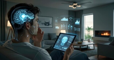 Man Analyzing Data On Tablet With Digital Interface Overlay Videos