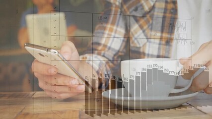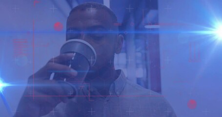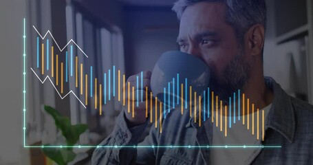 Man Drinking Coffee With Data Visualizations Overlay Videos