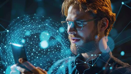 Man Engaging Digital Network Globe Using Smartphone Videos