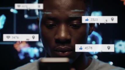 Man Engaging With Smartphone And Virtual Data Graphics Videos