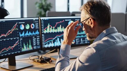 Man In Office Analyzing Statistical Data On Screen Videos